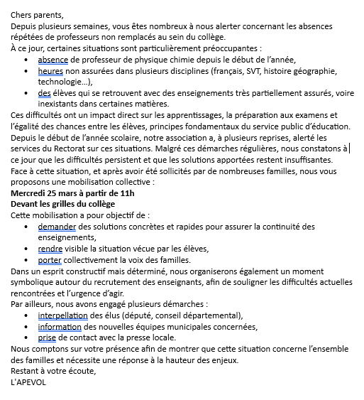 Message de l’APEVOL – Mobilisation au collège – 25 mars 2026