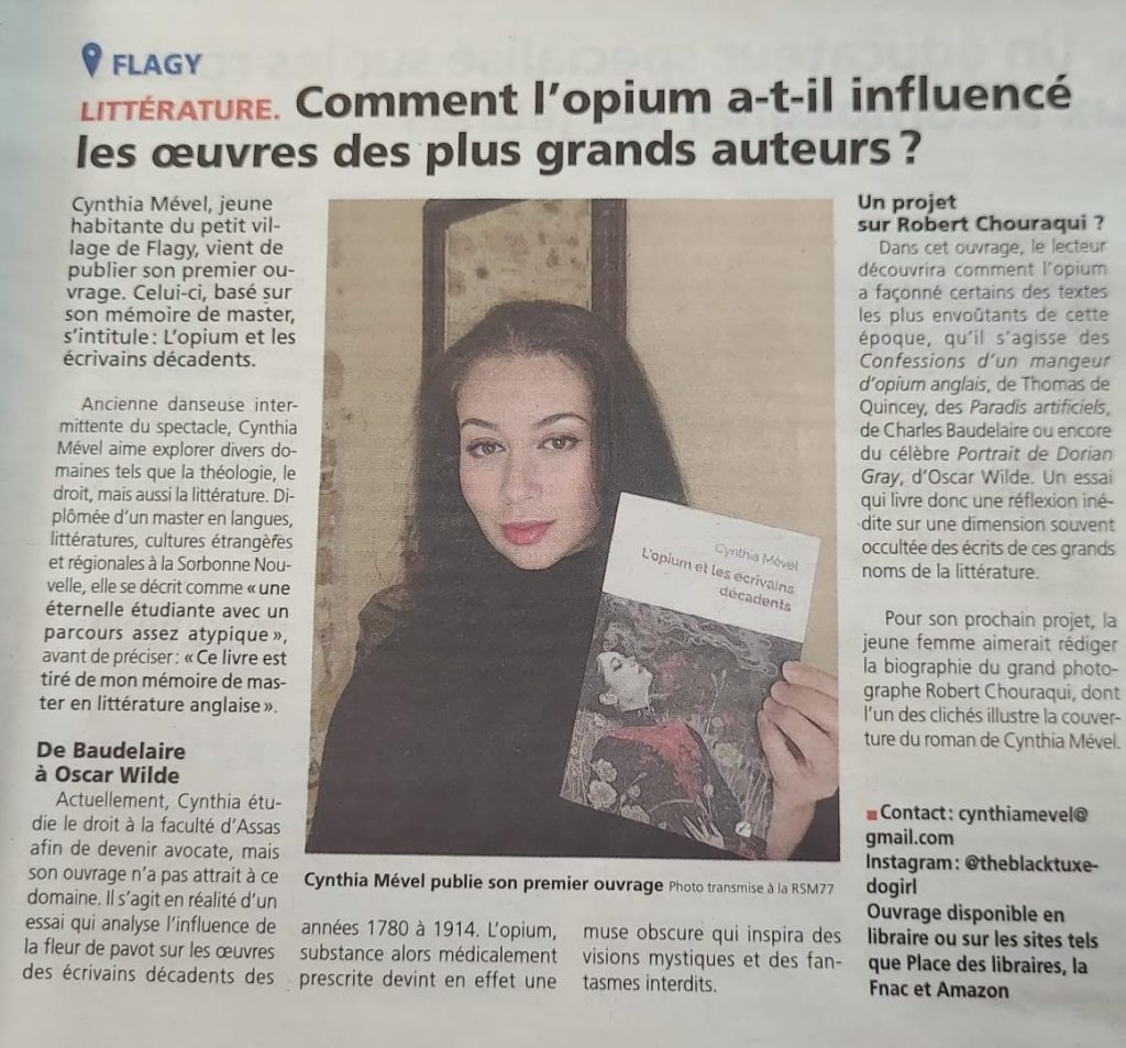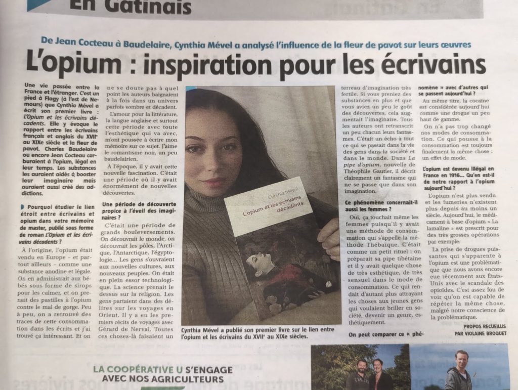 Une de nos concitoyennes, Cynthia Mével, vous propose un essai, paru aux éditions du Panthéon, relatant de l’influence de la fleur de pavot et son dérivé “récréatif” : l’opium sur de grands auteurs tels que Cocteau, Wilde, Beaudelaire ou de Quincey. Tantôt substance médicinale, tantôt substance prohibée, Cynthia vous propose une analyse historique sur son influence dans nos écrits, de 1780 à 1914.